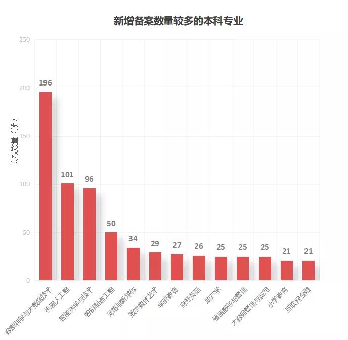 从数据上来看大数据、人工智能等与高新网络信息技术相关的专业开设占据半壁江山。