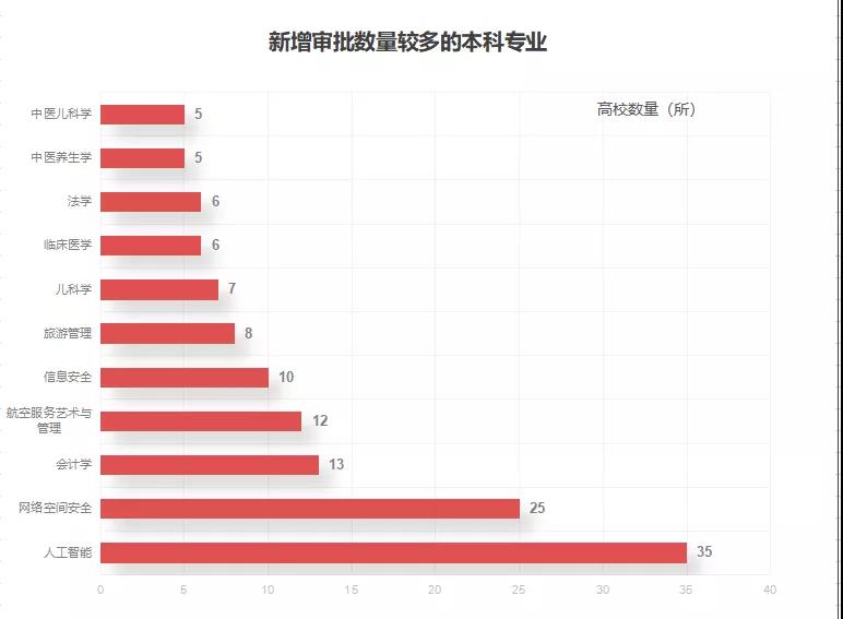 新增审批专业中,人工智能专业和网络空间安全数量分别有35所和25所,超过其他高校,位居第一位和第二位。会计学、航空服务艺术与管理、信息安全等专业较为火爆,新增专业较多。