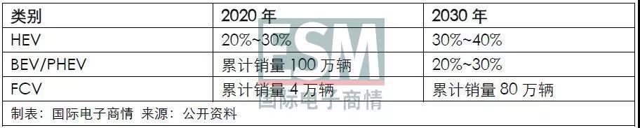 日本的在新能源汽车方面的计划是,以产业竞争为第一目标,最先实现HEV、FCV的产业化。2016年上半年,日本经济产业省发布《EV·PHV路线图》和《氢能/燃料电池战略路线图》,进一步明确了下一代汽车的普及目标:到2020年,下一代汽车将在新车销量中力争达到20%~50%,2030年这一比例达50%~70%。具体各种汽车类型的目标详见表1: