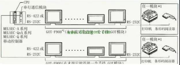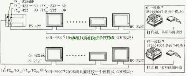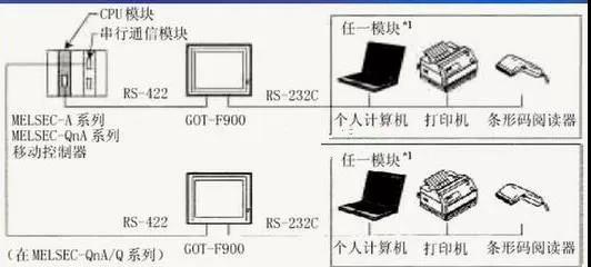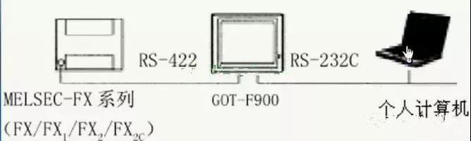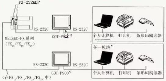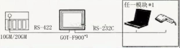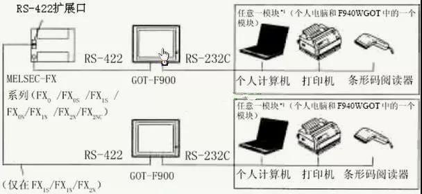 F900GOT (F920GOT-K除外)可以直接和FX定位模块(10GM/20GM)的编程口(RS—422)相连,通过GOT的RS232C接口,可以和个人计算机、打印机或条码阅读器相连。