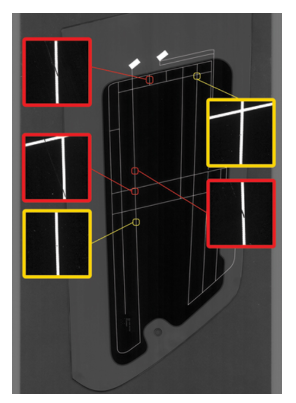 图4.如果软件检测到缺陷或异常,操作员通过HMI显示屏获得“光”图形指示器,并且覆盖标记缺陷的位置,允许操作员放大以进行进一步检查。红色表示失败,黄色表示警告。