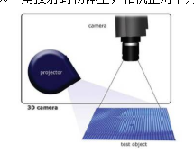 其基本原理也是三角测量,但是测试对象的整个表面都是用一次拍摄捕捉的。激光将光投射到条纹图案中,因此物体不必在传感器下方移动。光线从30°角投射到物体上,相机正对下方物体。