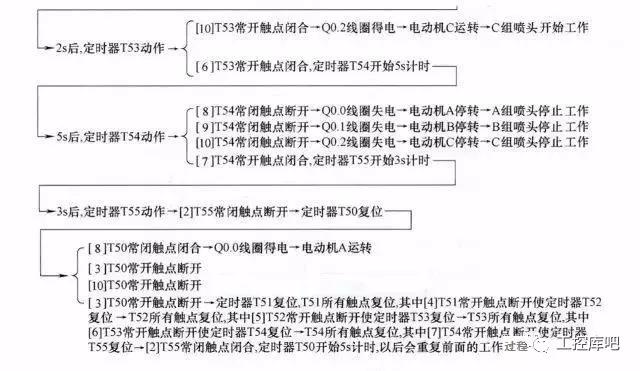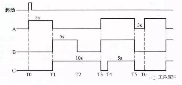 当按下起动按钮后,A组喷头先喷5s后停止,然后B、C组喷头同时喷,5s后,B组喷头停止、C组喷头继续喷5s再停止,而后A、B组喷头喷7s,C组喷头在这7s的前2s内停止,后5s内喷水,接着A、B、C三组喷头同时停止3s,以后重复前述过程。按下停止按钮后,三组喷头同时停止喷水。下图为A、B、C三组喷头工作时序图。