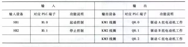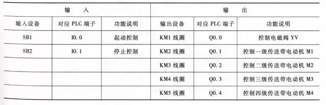 多级传送带控制需用到的输入/输出设备和对应的PLC端子见下表。