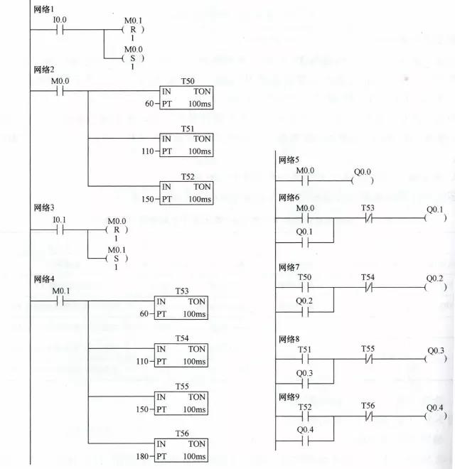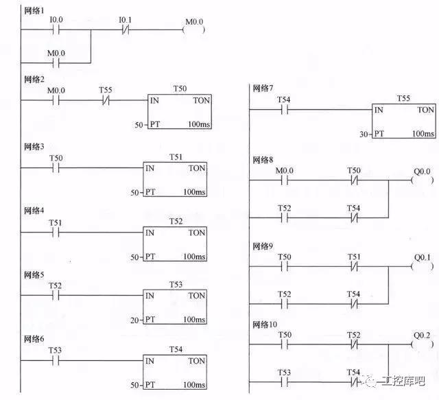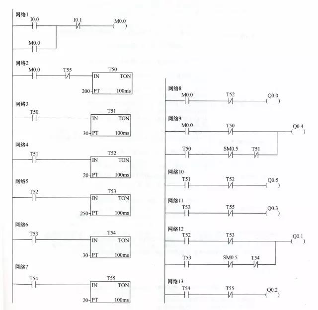 在上图所示的梯形图中,采用了一个特殊的辅助继电器SM0.5,称为触点利用型特殊继电器,它利用PLC自动驱动线圈,用户只能利用它的触点,即画梯形图里只能画它的触点。SM0.5能产生周期为1s的时钟脉冲,其高低电平持续时间各为0.5s,以上图梯形图网络9为例,当T50常开触点闭合,在1s内,SM0.5常闭触点接通、断开时间分别为0.5s,Q0.4线圈得电、失电时间也都为0.5s。