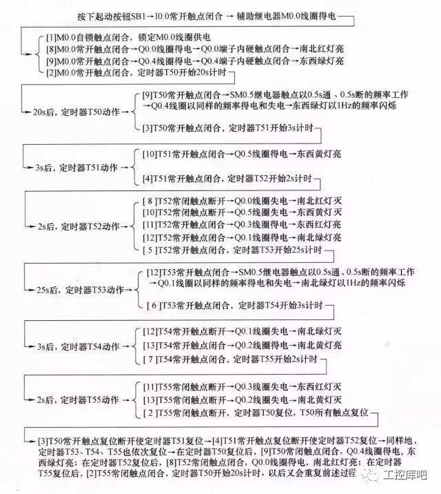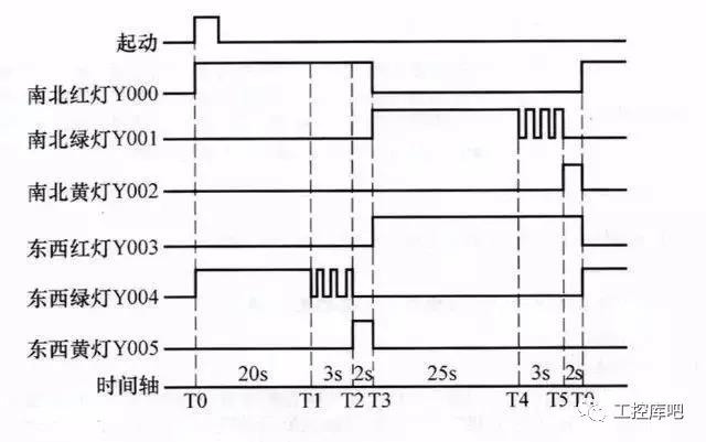当按下起动按钮后,南北红灯亮25s,在南北红灯亮25s的时间里,东西绿灯先亮20s再以1次/s的频率闪烁3次,接着东西黄灯亮2s,25s后南北红灯熄灭,熄灭时间维持30s,在这30s时间里,东西红灯一直亮,南北绿灯先亮25s,然后以1次/s频率闪烁3次,接着南北黄灯亮2s。以后重复该过程。按下停止按钮后,所有的灯都熄灭。交通信号灯的工作时序如下图所示。
