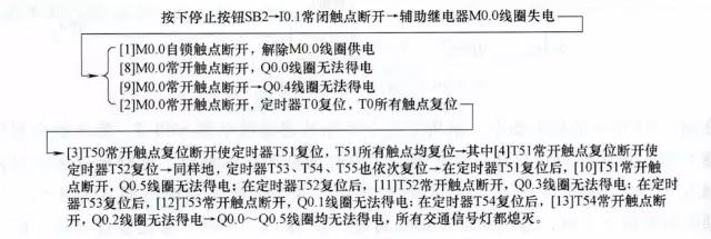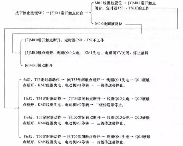 当按下停止按钮后,为了不让各传送带上有物料堆积,要求先关闭电磁阀YV,6s后让M1停转,M1停转5s后让M2停转,M2停转4s后让M3停转,M3停转3s后让M4停转。