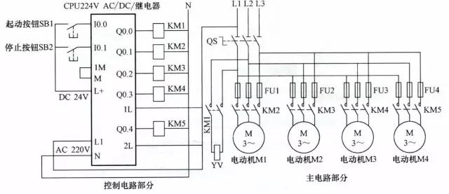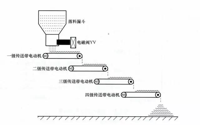 当按下起动按钮后,电磁阀YV打开,开始落料,同时一级传送带电动机M1起动,将物料往前传送,6s后二级传送带电动机M2起动,M2起动5s后三极传送带电动机M3起动,M3起动后4s后四级传送带电动机M4起动。