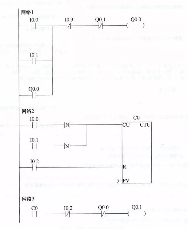启动STEP 7-Micro/WIN编程软件,编写满足控制要求的梯形图程序,编写完成的梯形图如下图所示。