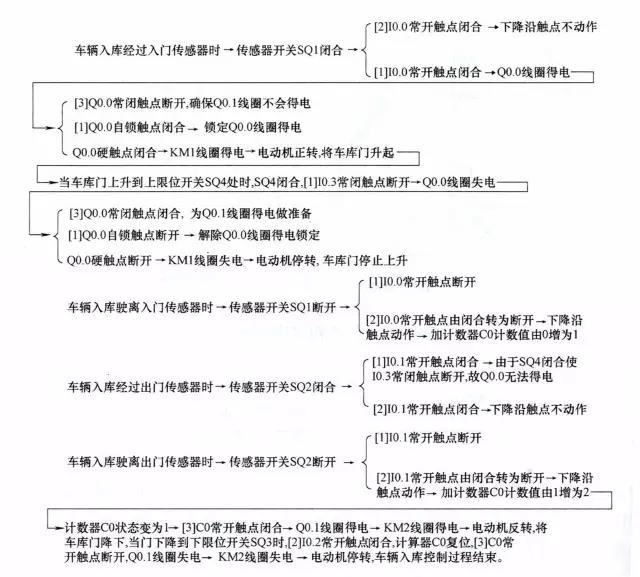 在车辆入库经过入门传感器时,入门传感器开关闭合,车库门电动机正转,车库门上升,当车库门上升到上限位开关处时,电动机停转;车辆进库经过出门传感器时,出门传感器开关闭合,车库门电动机反转,车库门下降,当车库门下降到下限位开关处时,电动机停转。