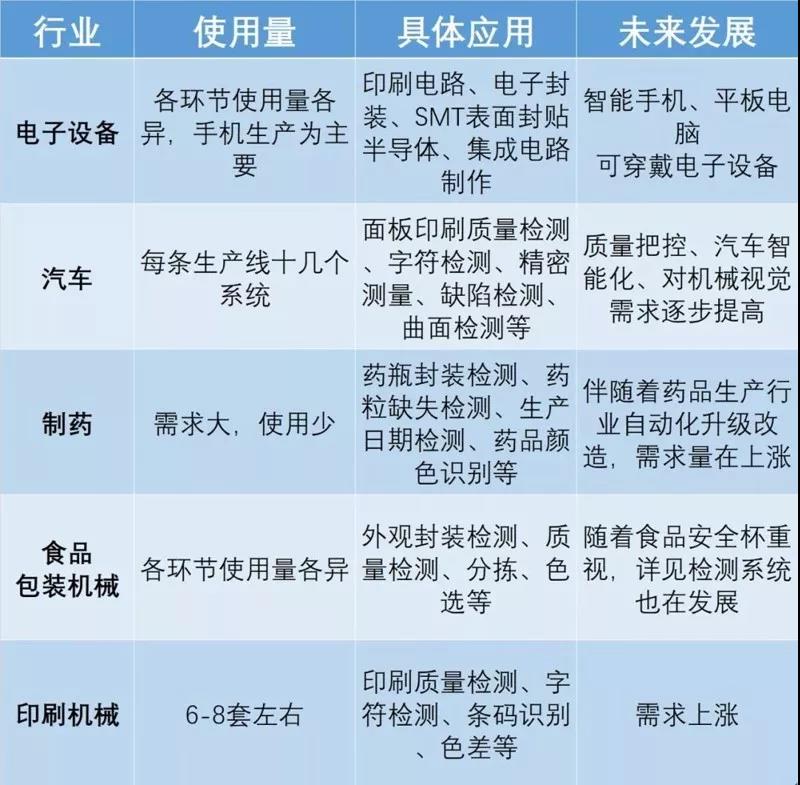 电子、汽车、冶金、食品饮料、零配件装配及制造等行业。随着国内制造业的快速发展,对于产品检测和质最的要求不断提高,各行各业对图像和机器视觉技术的工业自动需求将越来越大,因此机器视觉在未来制造业中将会有很大的发展空间。