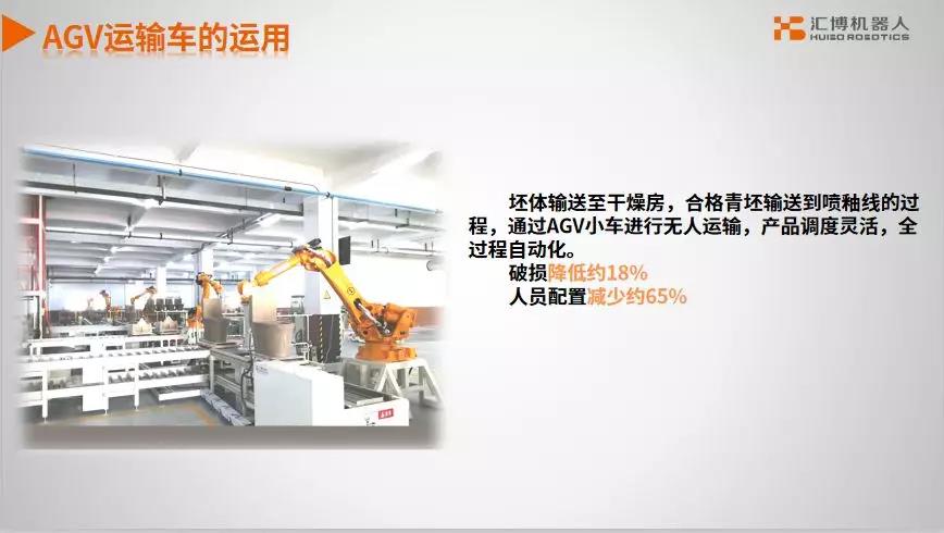 目前东鹏智能工厂工作环境较改造前有极大改善,项目在喷釉单柜、多工位打磨系统、分检线、成检线、立体存储系统以及AGV小车等多方面进行全面升级改造,其中全厂采用自动化高压成型线10条,六轴丝瓜IOS视频下载约60台,AGV自动车约55台,多层自动化输送线约为5000米;设备信息化管控系统1套。进行升级改造后,东鹏产线效率提升了300%,而员工人数由原995人减至306人,极大缩减了人工成本,产线上劳动强度大的工作都交给机器人完成,生产全流程均可控。