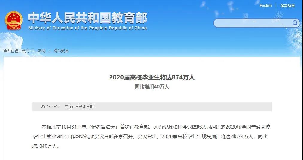 2020届高校毕业生规模预计将达到874万人,同比增加40万人!