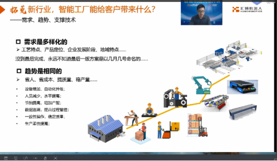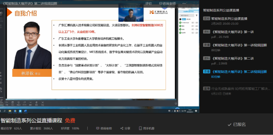 此前,由汇博机器人秦磊博士带来的《智能制造大咖开讲》第一讲,反响非常热烈并得到大家的肯定。但显然一场线上讲座是远不能够整体呈现智能工厂的全部精华,为此丝瓜视频污版在线观看特地邀请到汇博林泽钦博士为大家带来第二讲,针对走进新行业,且没有成熟案例如何才能拓荒新行业智能工厂建设的课题,为大家带来精彩的讲解。本次讲座共有一千多人参加了当天的直播,很多学员由于各种原因未能参加直播,但这丝毫不影响他们的学习热情,学员纷纷在学习群里找管理员索取录播网址进行学习,可见大家对汇博机器人实力及其课程的期待与支持! 本次培训,由汇博机器人工业领域广东汇博机器人研发副总监、大项目部部长,曾主持研发智能制造3000万以上工厂5个,从业经历10年的林泽钦博士主讲。在智能制造领域,能主持研发智能制造3000万以上项目5个,并且拥有10年从业经历,即便在高手云集,大咖层出的智造圈里,就这一点而言也足以称得上优秀。林博士为学员们带来了精彩讲座,切实帮助大家提高了实战技能。为时一个半小时的公益直播课内容丰富,互动充分,既有前沿的技术,又有实用的项目讲解。 课程内容充实,干货满满! 晚上20:00,林博士正式帅气登场,准时开讲。幽默风趣的开场白和自我介绍、儒雅的学者风范马上收获了大家的好感,圈粉无数。
