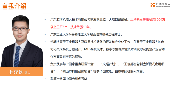 作为广东汇博机器人技术有限公司研发部副总监,大项目部部长。广东工业大学&香港理工大学联合培养机械工程博士。林博士主持研发智能制造3000万以上项目工厂超过5个,从业经历10年。获第十八届中国专利优秀奖。长期从事丝瓜IOS视频下载及应用技术装备的研发和产业化工作,在基于丝瓜IOS视频下载的自动化集成系统方案设计、MES系统、数字孪生等关键技术研究以及陶瓷产业自动化方面具有丰富的经验。负责及参与“国家重点研发计划”、“火炬计划”、“工信部智能制造新模式应用项目”、“佛山市科技创新项目”等多个国家级、省市级的机器人项目。年轻有为获得业内极大认可。