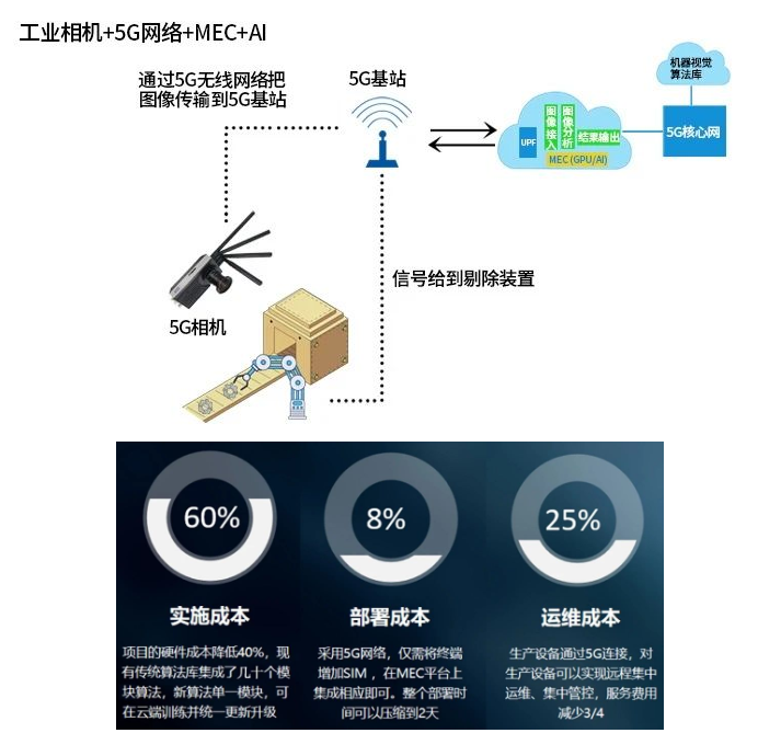 3.软件算法处理从每条产线的PC转移到MEC服务器端,实现设备端轻量化及灵活性,MEC端利用GPU集群提供超高的渲染能力及计算能力,减少了硬件及算力浪费。