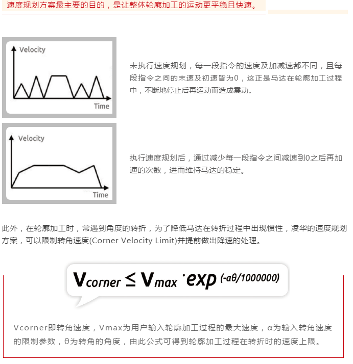 针对激光加工机稳定度的问题,凌华科技提出速度规划(Velocity Planning)解决方案,使用者仅需决定整体轮廓加工运动的最大速、加速度及转角时的速度上限,无需繁复的指令设定,即可在轮廓加工过程中,维持马达的稳定性。
