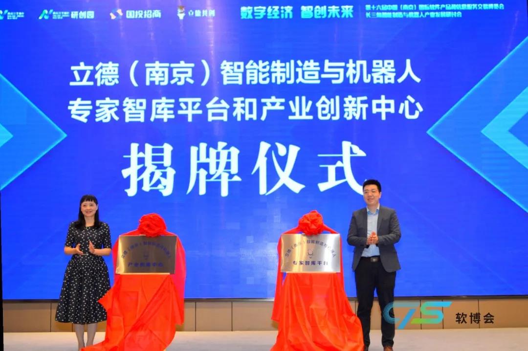 在全体参会人员的见证下,南京江北新区党工委委员、管委会副主任陈潺嵋与北京立德共创智能机器人科技有限公司总经理潘月博士共同为立德(南京)智能制造与机器人专家智库平台与产业创新中心揭牌。