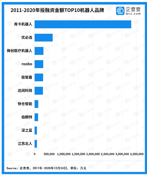 企查查大数据研究院日前发布的《近十年机器人行业投融资分析报告》显示,近十年我国机器人赛道共发生投融资事件2661件,总投融资金额超1385亿元,年度融资额最高峰出现在2017年,当年总金额达到524.7亿。其中,2020年全行业共发生投融资事件242起,总金额约为267.7亿元。丝瓜IOS视频下载(特指狭义上的重工业制造类机器人)拿到的融资笔数最多,占比33%,其次是物流机器人、医疗机器人,分别占比22%、16%。242起投融资事件中,亿元级别的项目共64个,微创医疗机器人以30亿元融资夺得单轮融资金额榜首。从近十年来的融资金额排名来看,企查查数据显示,“库卡机器人”于2017年获330.7亿元并购融资,排名首位,美的为其幕后“金主”。位居次席的“优必选”十年来共获八次融资,总金额达61.7亿元。“微创医疗机器人”则是凭借2020年获得的单笔30亿融资,跃升至榜单第三。