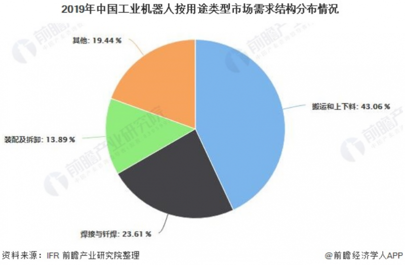 其中,搬运和上下料作为首要应用领域,2019年销售6.2万台,同比下降4.4%,在总销量中的比重提高至43.06%;焊接与钎焊机器人销售3.4万台,同比下降16%,占比为23.61%;装配及拆卸机器人销售2万台,同比下降16.7%,占比为13.89%;加工领域机器人销售同比增长105.5%,是唯一实现销量增长的应用领域。