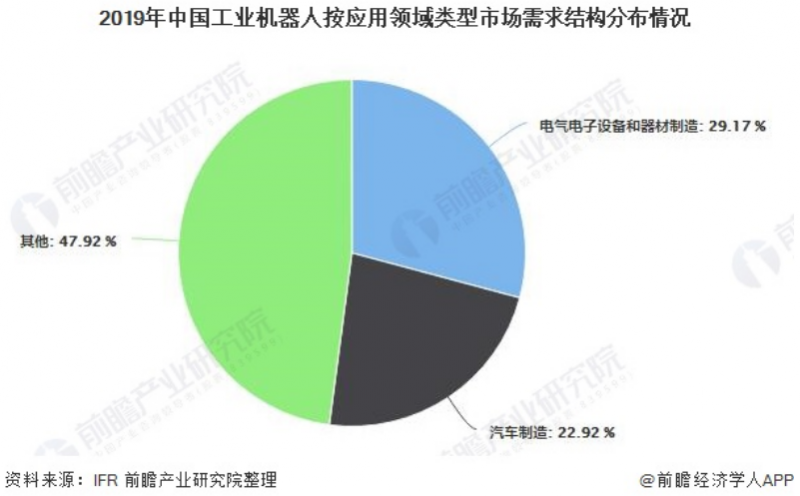 从应用行业看,电气电子设备和器材制造连续第四年成为中国市场的首要应用行业,2019年销售超过4.2万台,同比下降8.9%,占中国市场总销量的29.17%;汽车制造业仍然是十分重要的应用行业,2019年采购机器人3.3万台,销量在上年的基础上继续下降17.1%,在中国市场总销量的比重下降至22.92%。