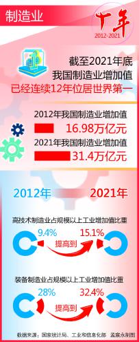 制造业是立国之本、兴国之器、强国之基。党的十八大以来,我国制造业大国地位进一步巩固,重点领域不断取得突破,产业结构优化持续加快。一批有世界影响力的优势产业引领创新;一批世界卓越的大型企业和制造业单项冠军企业不断涌现;一批世界级先进制造业集群加快形成……国家统计局、工业和信息化部的数据显示,2012年至2021年,我国制造业增加值从16.98万亿元增长到31.4万亿元。高技术制造业、装备制造业占规模以上工业增加值的比重分别从2012年的9.4%、28%提高到2021年的15.1%、32.4%。截至2021年底,我国制造业增加值已经连续12年位居世界第一。中国制造正向中国创造大步迈进。