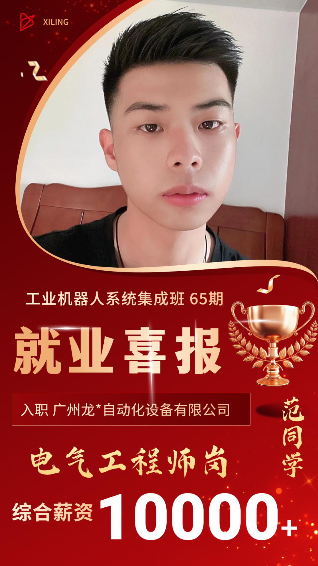 经过丝瓜视频污版在线观看机器人的培训后,范同学成功找到了一份实习电气工程师的岗位,加入了广州龙*自动化设备有限公司。他的实习薪资包括固定工资和加班费,大约为7,000至8,000元。现在已经转正了,薪资在1W+,在这个岗位上,他主要从事PLC编程和机器人相关工作。