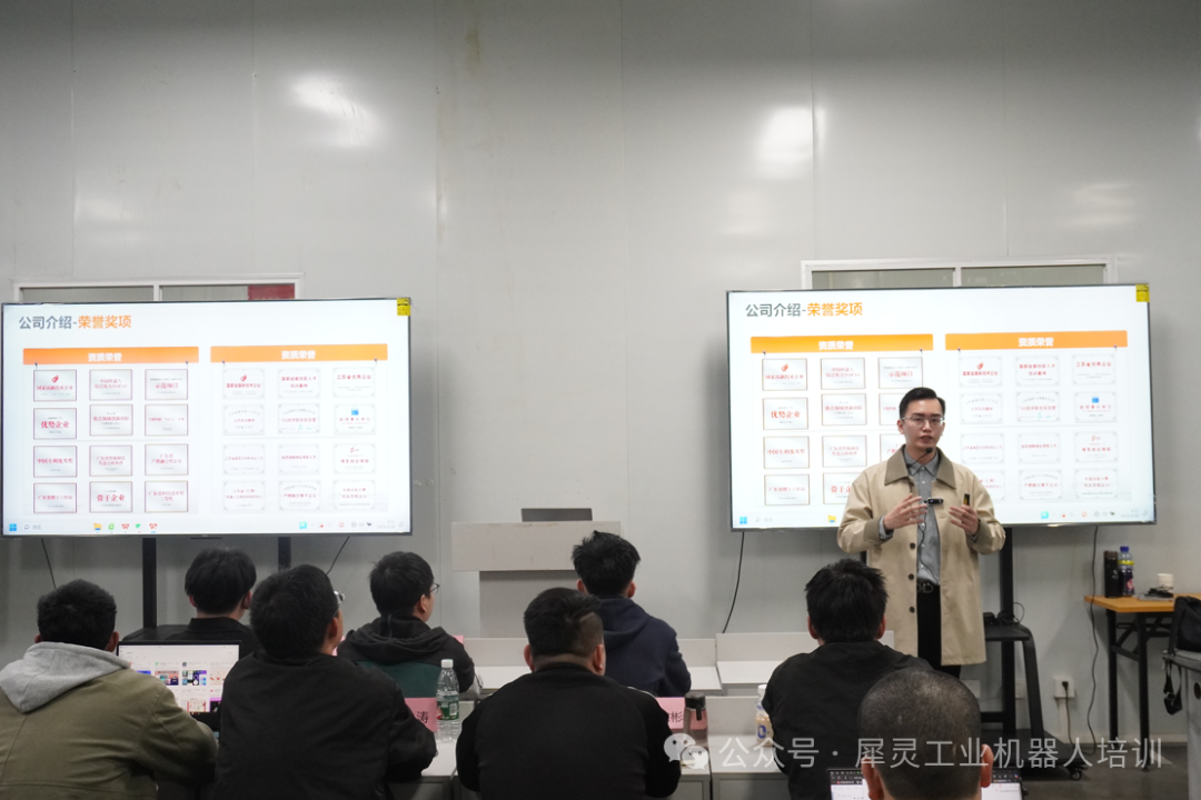 课程开启后,“大班理论 + 小班实操” 的优势充分显现。理论课堂上,讲师借助双屏展示企业荣誉、技术案例,结合行业前沿动态,构建起完整的知识体系。从机器人基础原理到自动化项目设计逻辑,学员们专注记录、积极互动,思维在专业知识的碰撞中不断升级。