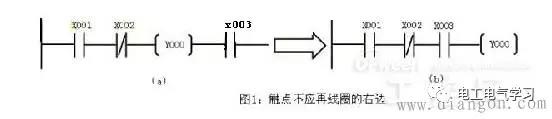 一,梯形阶梯都是始于左母线,终于右母线(通常可以省掉不画,仅画左母线)。每行的左边是接点组合,表示驱动逻辑线圈的条件,而表示结果的逻辑线圈只能接在右边的母线上。接点不能出现在线圈右边。如下图(a)应改为(b):