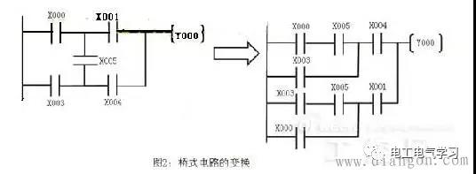 二,接点应画在水平线上,不应画在垂直线上,如下图(a)中的接点X005与其它接点间的关系不能识别。对此类桥式电路,应按从左到右,从上到下的单向性原则,单独画出所有的去路。如图(b)所示: