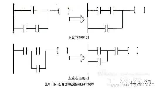 三,并联块串联时,应将接点多的去路放在梯形图左方(左重右轻原则);串联块并联时,应将接点多的并联去路放在梯形图的上方(上重下轻的原则)。这样做,程序简洁,从而减少指令的扫描时间,这对于一些大型的程序尤为重要。如下图所示: