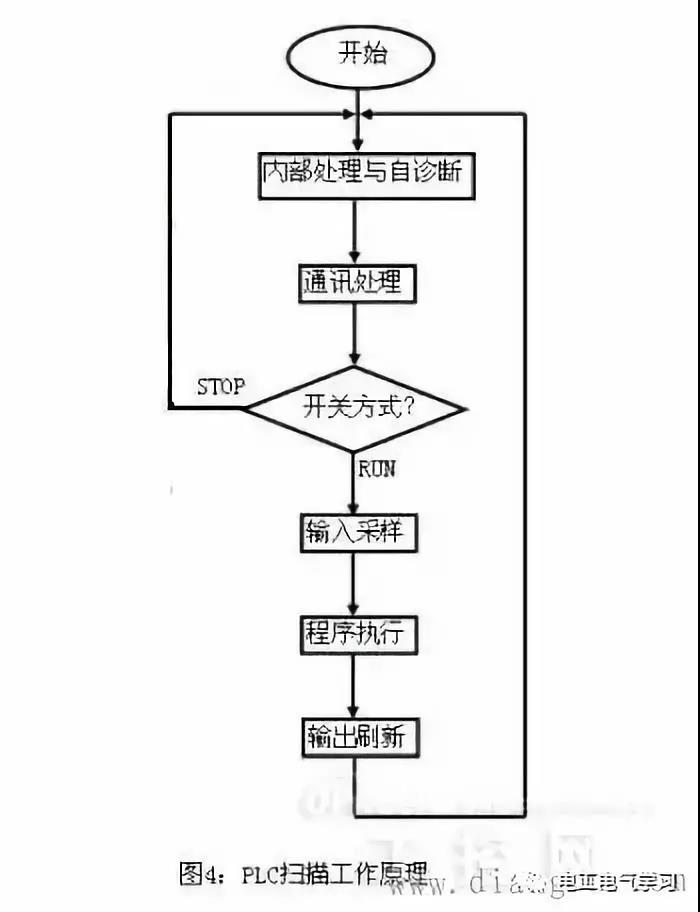 PLC的CPU采用循环扫描的工作方式。一般包括五个阶段(如图所示):内部诊断与处理,与外设进行通讯,输入采样,用户程序执行和输出刷新。当方式开关处于STOP时,只执行前两个阶段:内部诊断与处理,与外设进行通讯。
